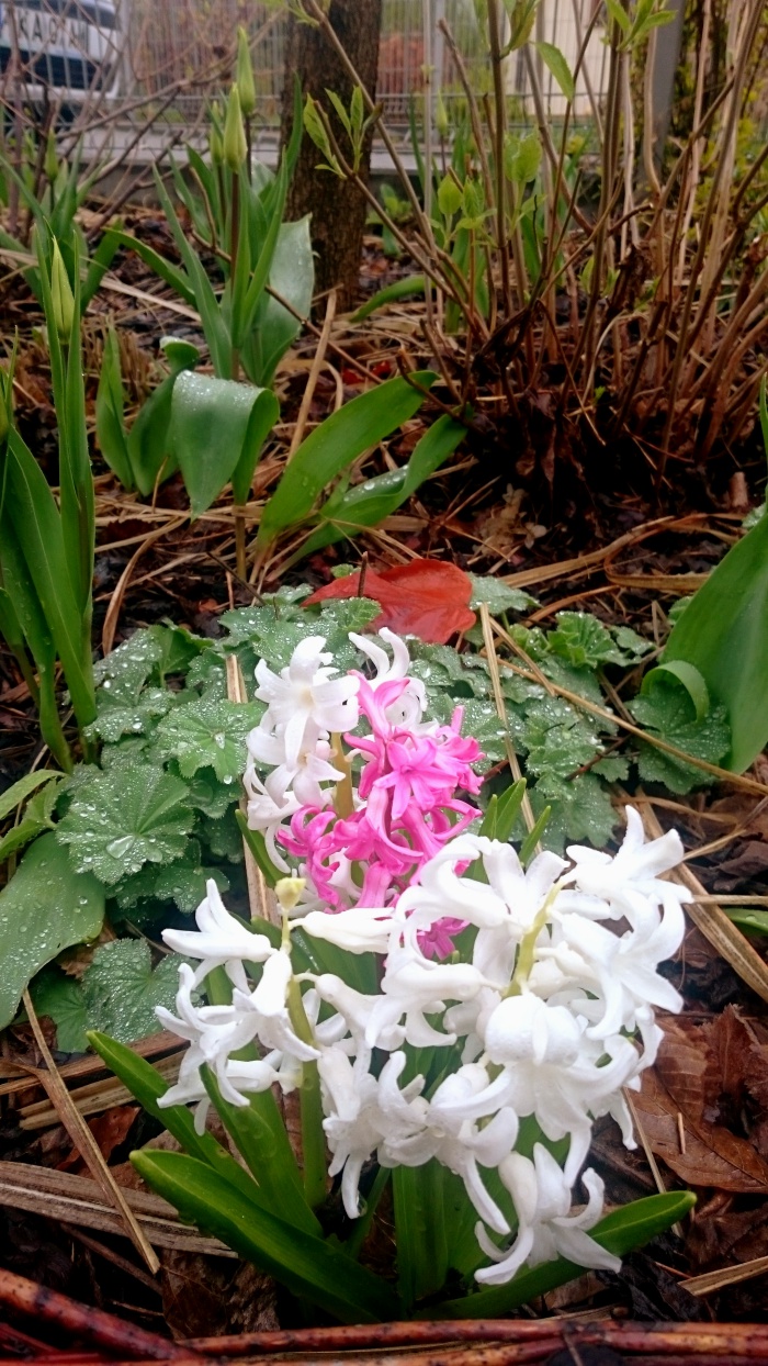 Dziś po pracy wyszłam na chwilkę na ogród...baaardzo zimno, ale....zdaje się, że roślinom to nie przeszkadza :). Hiacynty pięknie pachną, nawet podczas deszczu, a tulipany za chwileczkę rozpoczną swój spektakl.